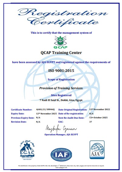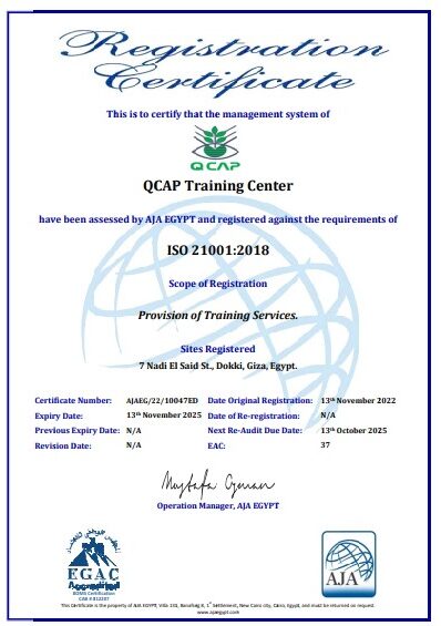 - مركز تدريب كيوكاب حاصل على اعتماد ISO 21001 : 2018 و ISO 9001 : 2015